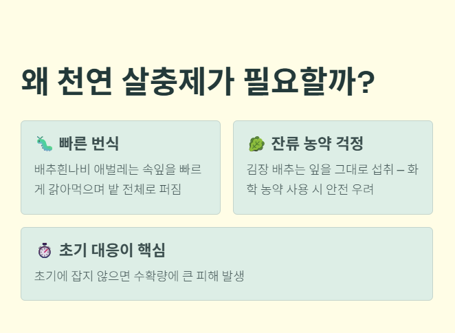특히 배추 벌레(청벌레)는 빠르게 번식하고 잎을 갉아먹어 피해를 키우기 때문에 빠른 대응이 중요합니다. 하지만 화학 농약을 사용하기에는 먹거리 안전이 걱정되고, 그렇다고 방치하면 수확에 큰 영향을 줄 수 있습니다.