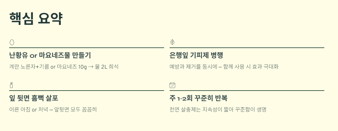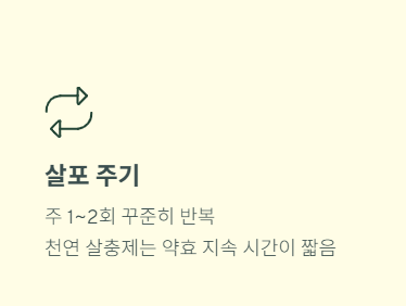 천연 살충제는 꾸준히 사용하는 것이 효과를 높이는 핵심입니다. 올바른 시기와 방법으로 관리하면 화학 농약 없이도 충분히 피해를 줄일 수 있습니다.