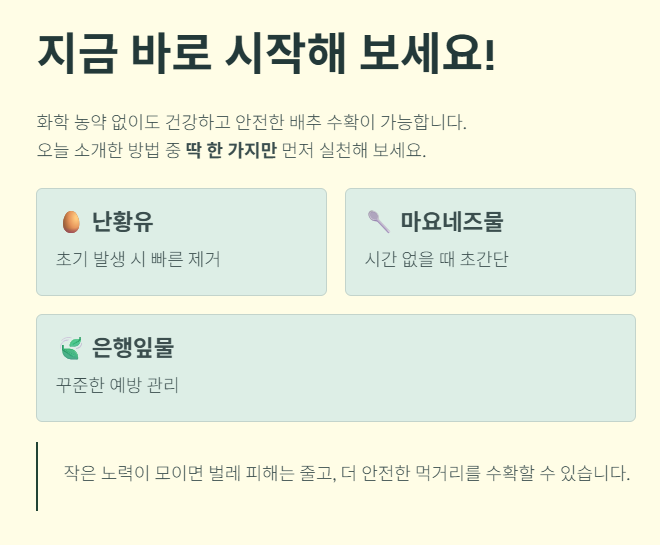 오늘 소개한 배추 벌레 방제 방법 중 하나만이라도 지금 바로 실천해 보세요. 직접 해보는 것이 가장 빠른 해결 방법입니다.