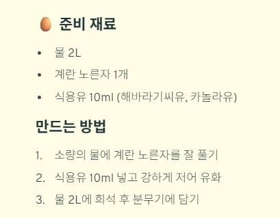 물 2L, 계란 노른자 1개, 식용유 10ml (해바라기씨유, 카놀라유 등) - 만드는 방법