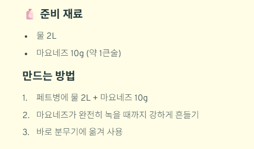 3. 완성된 원액을 물 2L에 희석한 뒤 분무기에 담습니다. - 사용 팁