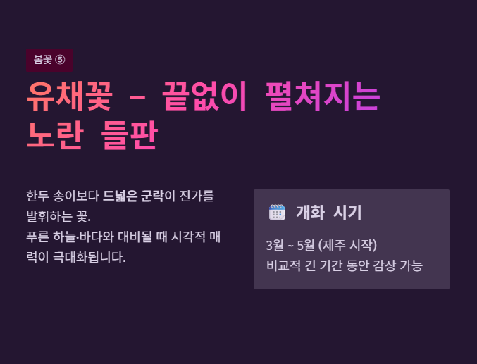 - 유채꽃: 넓은 들판을 가득 채우며 오랫동안 볼 수 있는 노란 꽃