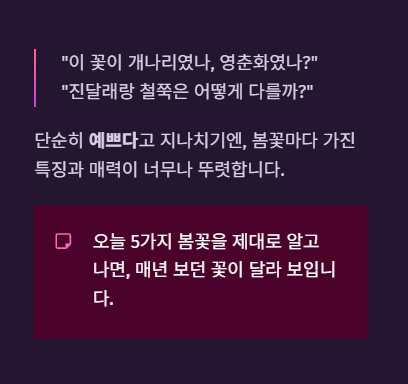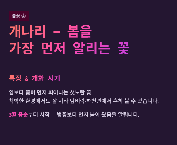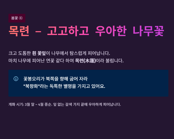 단순히 예쁘다고만 느끼고 지나가기엔 봄꽃마다 가진 특징과 매력이 뚜렷합니다.