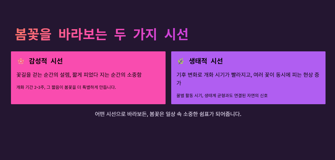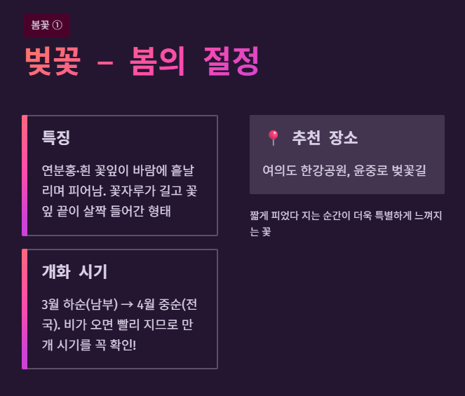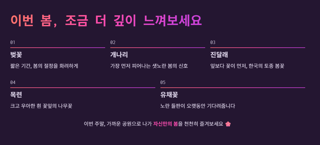 이처럼 봄꽃을 다양한 감각으로 느끼면, 단순한 나들이가 아니라 오래 기억에 남는 특별한 경험이 됩니다.