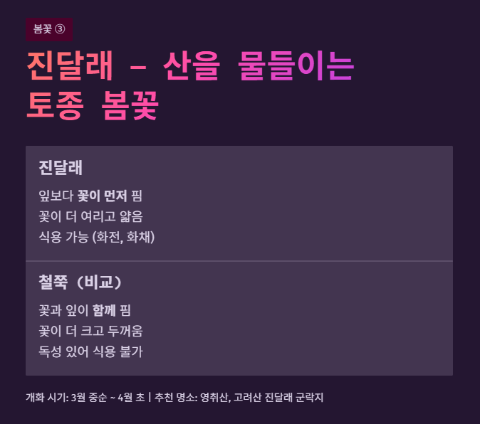 - 진달래: 철쭉과 달리 잎보다 꽃이 먼저 피는 한국 토종 꽃