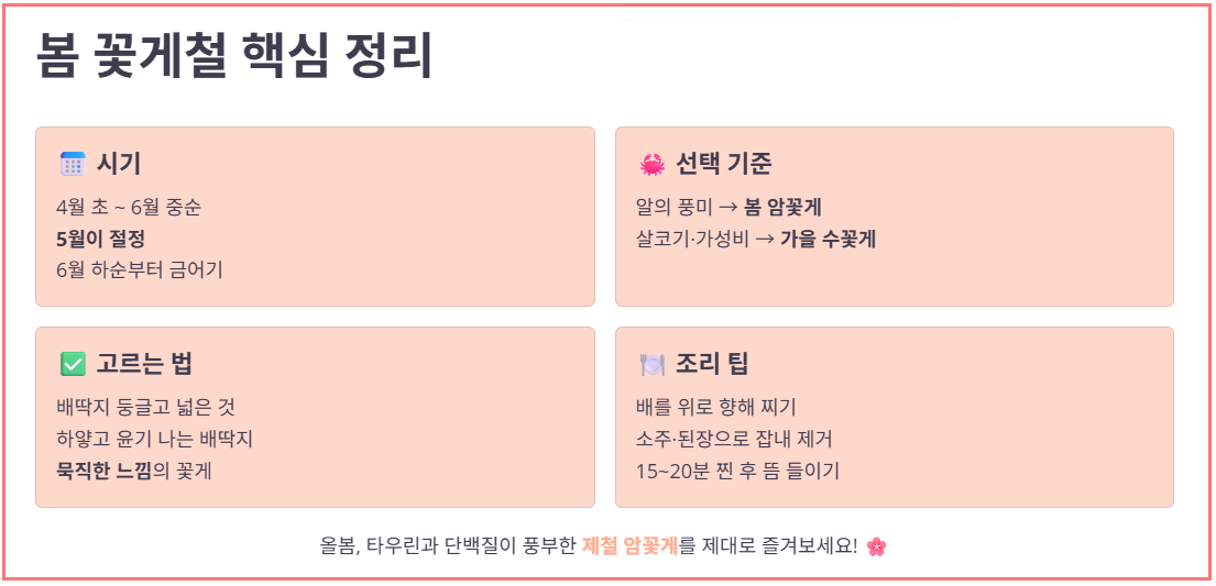 지금까지 봄 꽃게철의 시기와 특징, 그리고 고르는 방법까지 살펴보았습니다. 핵심 내용을 정리하면 다음과 같습니다.