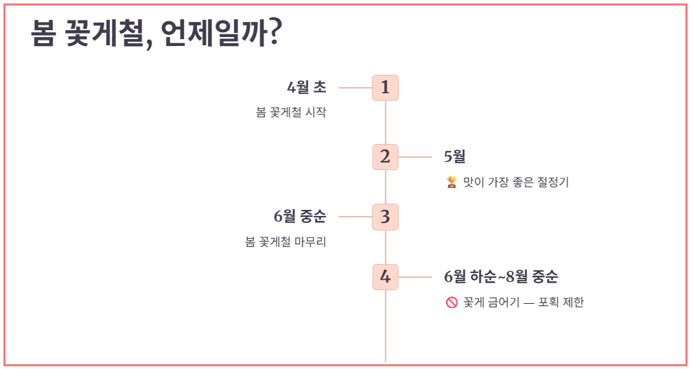 - 봄 꽃게철 시기: 4월 초부터 6월 중순까지이며, 5월이 맛이 좋은 시기로 알려져 있습니다. 6월 하순부터는 금어기가 시작됩니다.