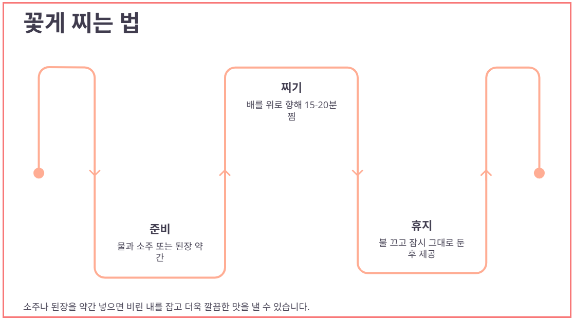 끓는 물에 소주나 된장을 약간 넣고 15~20분 정도 찐 뒤, 불을 끄고 잠시 뜸을 들이면 더욱 깔끔한 맛을 낼 수 있습니다.