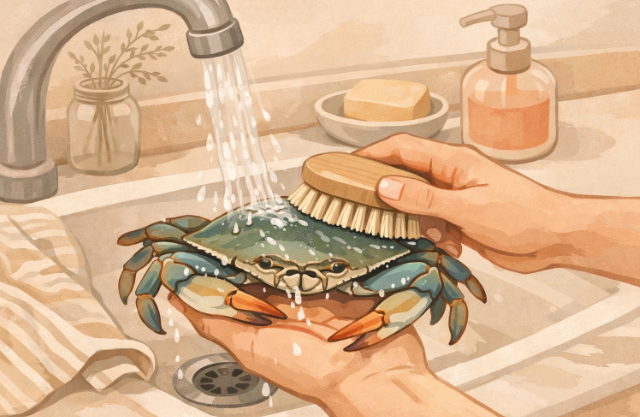 조리 전 흐르는 물에 솔을 이용해 꽃게를 깨끗하게 세척합니다.