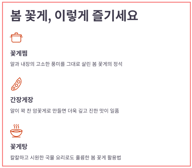 간단한 찜 요리나 간장게장으로 활용하면 봄철 식단에 다양하게 활용할 수 있습니다.