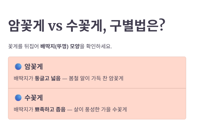 배딱지가 둥글고 넓은 형태라면 암꽃게, 뾰족하고 좁은 형태라면 수꽃게입니다.