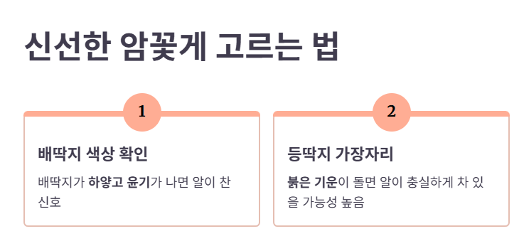 배딱지 부분이 하얗고 윤기가 나며, 등딱지 가장자리에 붉은 기운이 돌면 알이 찬 상태일 가능성이 높습니다.