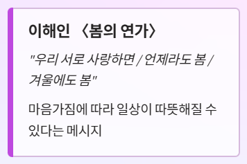 "우리 서로 사랑하면 / 언제라도 봄 / 겨울에도 봄"