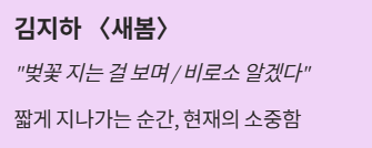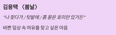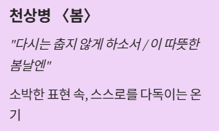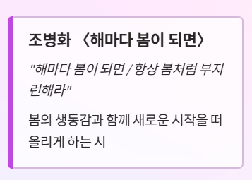 짧은 문장 속에서도 봄의 풍경과 감정을 섬세하게 느끼며, 우리말이 가진 아름다움을 자연스럽게 경험할 수 있습니다.