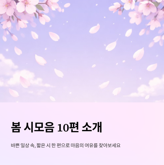 이번 글에서는 봄 시모음을 중심으로, 부담 없이 읽기 좋은 시 10편을 소개하고 감상하는 방법도 함께 정리해 보겠습니다.
