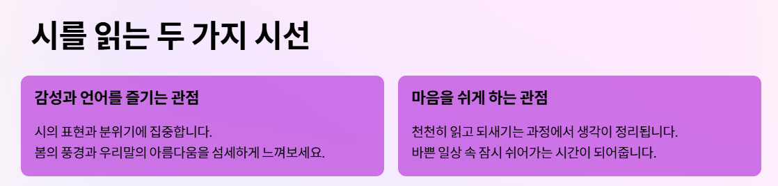 시를 읽는 과정은 바쁜 일상 속에서 잠시 마음을 정리하는 데 도움이 될 수 있습니다. 아래 흐름에 따라 천천히 읽어보세요.