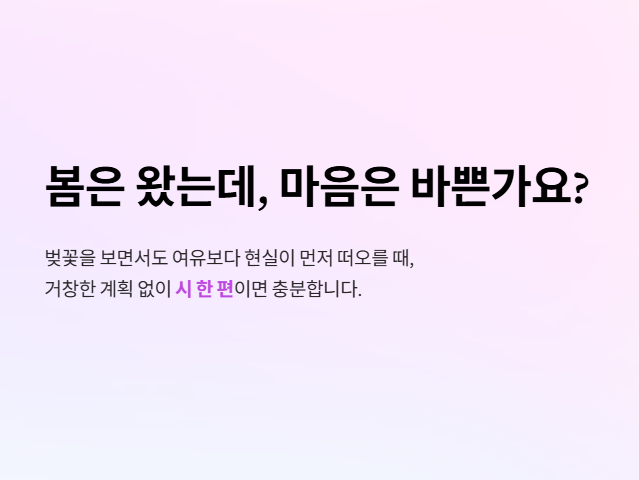 이럴 때는 거창한 계획 없이도 잠시 멈춰 서서 짧은 시 한 편을 읽어보는 것만으로도 마음의 여유를 찾는 데 도움이 될 수 있습니다.