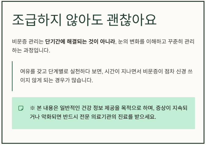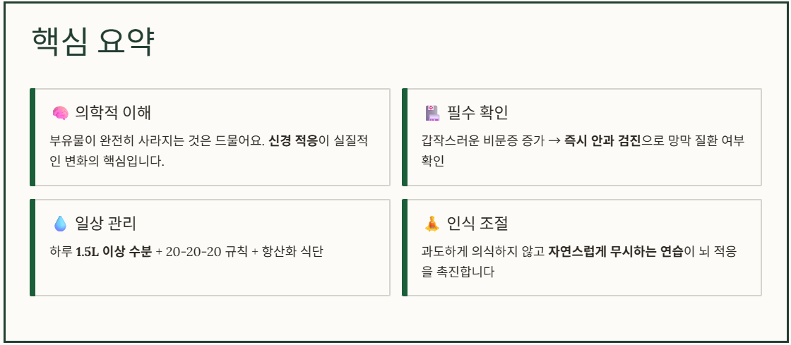 이번 경험을 계기로 눈 건강을 위한 생활 습관을 점검하고, 앞서 소개한 단계별 관리 방법을 꾸준히 실천해 보는 것이 도움이 될 수 있습니다.