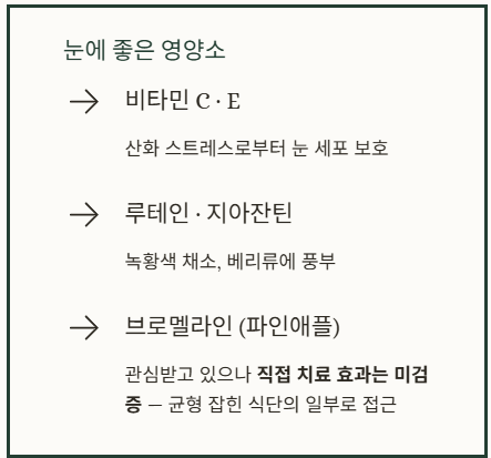 눈 건강을 유지하기 위해서는 항산화 영양소가 풍부한 식단이 도움이 될 수 있습니다. 비타민 C, 비타민 E, 루테인, 지아잔틴 등이 포함된 녹황색 채소와 베리류를 꾸준히 섭취하는 것이 좋습니다.