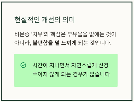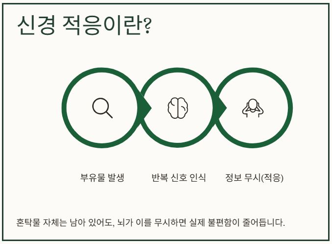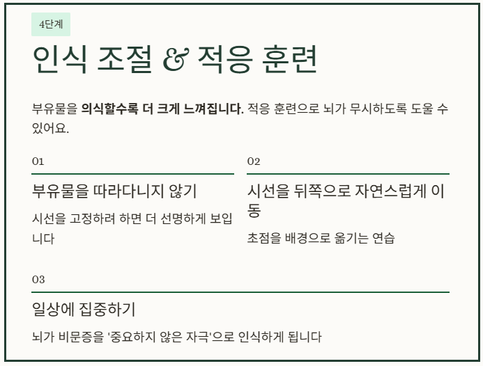 물리적으로 부유물이 완전히 사라지는 경우는 드물며, 뇌가 해당 자극에 점차 적응하여 불편함을 덜 느끼게 되는 ‘신경 적응’이 실제로 중요한 변화 과정입니다. - 필수 확인 사항