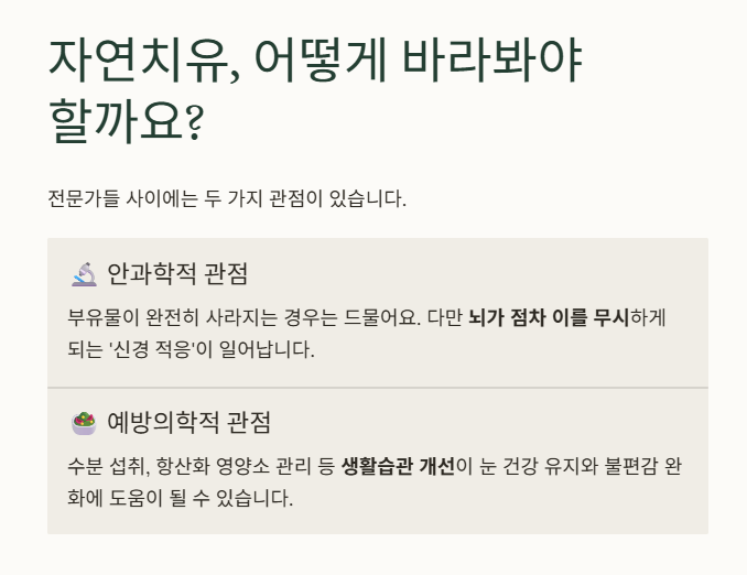 비문증 자연치유는 단기간에 해결되는 개념이라기보다, 눈의 변화와 적응 과정을 이해하고 관리하는 과정으로 보는 것이 중요합니다.