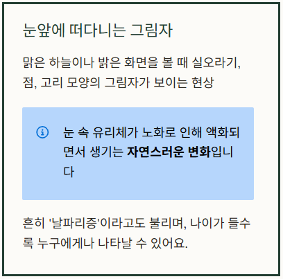 하지만 시간이 지나면서 부유물이 시야 중심에서 벗어나거나, 뇌가 이를 불필요한 정보로 인식해 점차 신경적으로 무시하게 되는 ‘신경 적응(Neuroadaptation)’이 나타날 수 있습니다. 이 경우 혼탁물 자체는 남아 있지만 실제 불편함은 감소하게 되며, 이를 현실적인 의미의 개선으로 볼 수 있습니다.