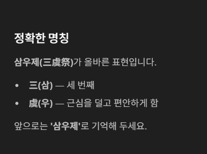 - 올바른 명칭: ‘삼오제’는 잘못 알려진 표현이며, 고인의 영혼을 위로하는 의미의 ‘삼우제(三虞祭)’가 정확한 명칭입니다.