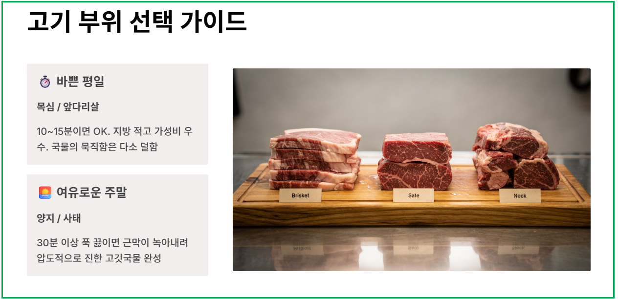 2. 고기 부위 선택법: 가성비(목심/앞다리) vs 깊은 맛(양지/사태)