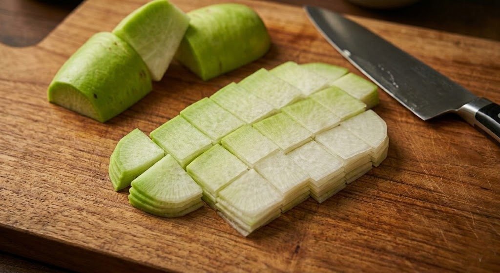 - 무: 무는 쓴맛이 적고 단맛이 강한 초록색 윗부분을 사용하는 것이 좋습니다. 숟가락으로 떠먹기 편하도록 0.5cm 두께로 나박썰기하여 준비합니다.
