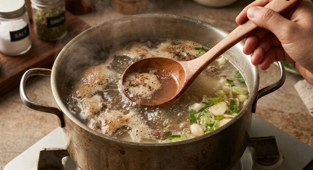 - 물이 바글바글 끓어오르며 표면으로 갈색 거품(고기 핏물과 불순물)이 떠오릅니다. 이 거품을 숟가락이나 국자로 깔끔하게 모두 걷어내야 텁텁함 없이 맑고 개운한 국물이 완성됩니다.