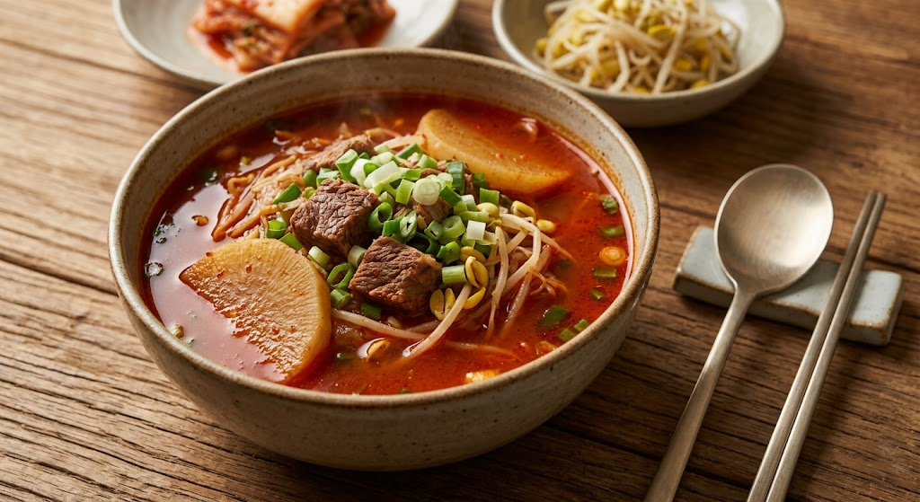- 경상도식 얼큰한 무국: 고춧가루를 듬뿍 풀어 붉게 만들고, 콩나물과 대파를 산더미처럼 넣어 끓이는 '장터국밥' 스타일입니다. 맵고 칼칼한 맛이 소고기의 기름기를 완벽하게 잡아주며, 땀을 내게 하여 훌륭한 해장용 국물 요리나 술안주로 기능합니다.