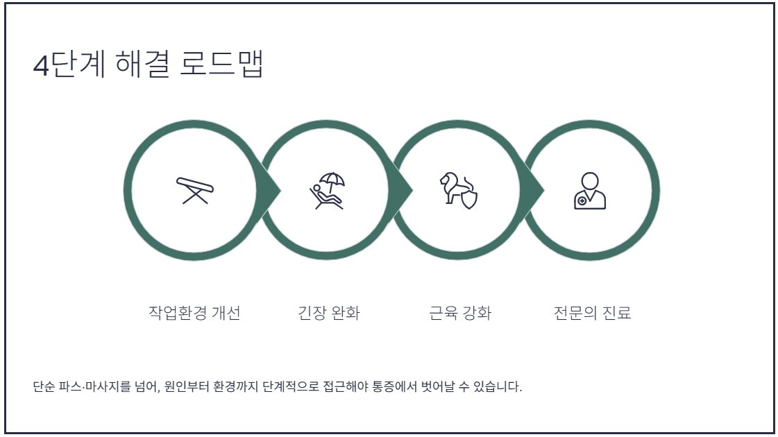 단순한 마사지로는 승모근 통증을 근본적으로 없앨 수 없습니다. 다음 4단계를 차근차근 실천해 보세요.
