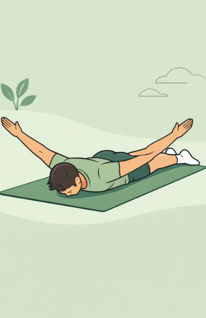 - Y레이즈 운동: 바닥에 엎드린 상태에서 양팔을 Y자로 뻗고, 엄지손가락이 하늘을 향하게 한 뒤 팔을 위로 가볍게 들어 올립니다. 날개뼈 아래쪽(하부 승모근)의 자극을 느끼며 10회씩 3세트 반복합니다. 어깨가 말려 올라가지 않도록 주의하세요.