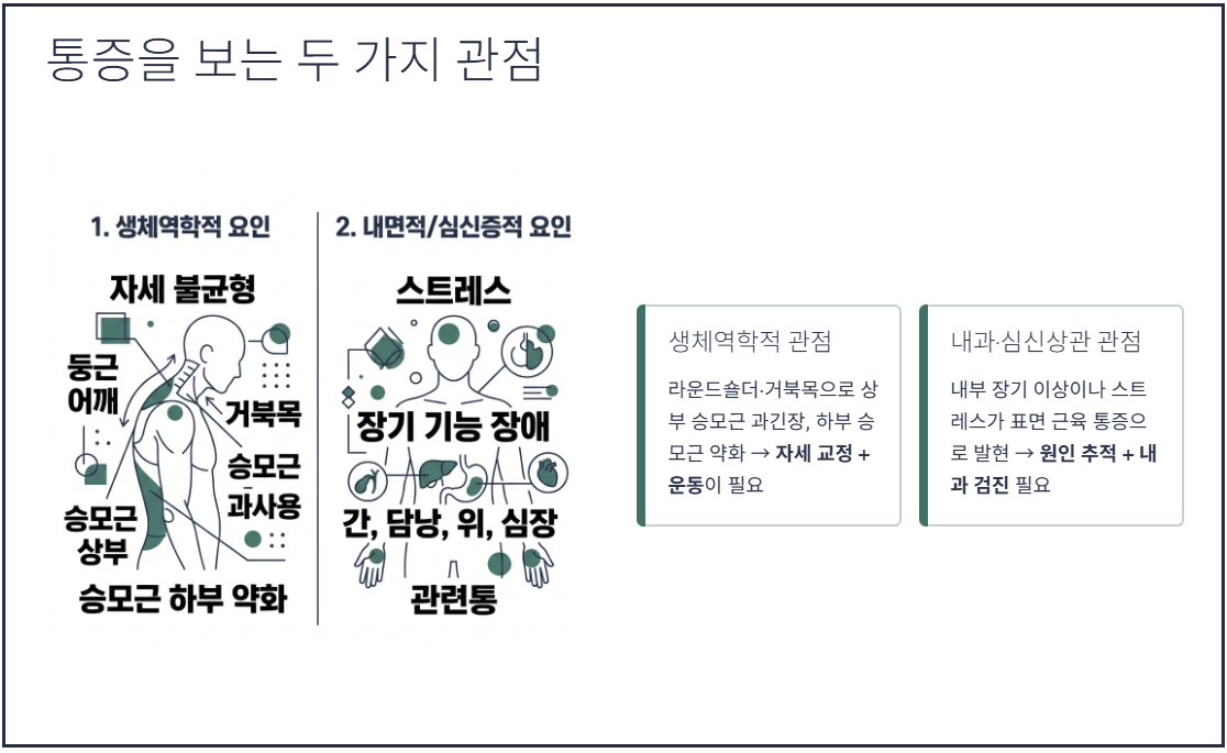 이 관점에서는 근육 자체의 문제가 아니라 내부 장기의 문제나 심리적 스트레스가 표면적인 근육 통증(연관통)으로 발현된다고 봅니다. 아무리 물리치료를 받아도 낫지 않는다면, 식습관 개선, 수면의 질 향상, 스트레스 관리, 내부 장기 질환 검사 등 몸속 원인을 찾아야 한다고 설명합니다.
