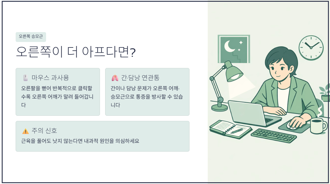 - 오른쪽 승모근 통증은 마우스 과사용이나 간/담낭 질환과 연관될 수 있습니다.