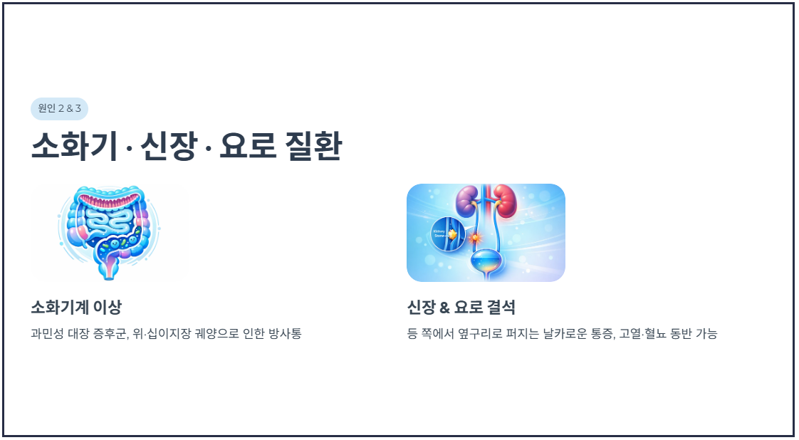 - 신장 및 요로 질환: 오른쪽 신장에 세균 감염(신우신염)이 생기거나 요로 결석이 발생하면, 등 쪽 늑골 아래부터 시작해 옆구리를 타고 앞쪽으로 퍼지는 날카로운 통증이 특징입니다. 이때는 고열이나 혈뇨가 동반되기도 합니다.