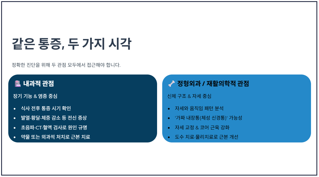 내과 전문의들은 통증과 '신진대사 및 염증 반응'의 연관성에 집중합니다. 통증이 식사 전후 언제 나타나는지, 열이 나거나 황달, 체중 감소, 구토 등의 전신 증상이 동반되는지를 살핍니다. 이 관점에서는 복부 초음파, CT, 혈액 검사를 통해 눈에 보이지 않는 내부 장기의 염증, 결석, 혹은 종양 여부를 빠르게 찾아내고 약물이나 외과적 처치로 근본적인 원인을 제거하는 데 목적을 둡니다.