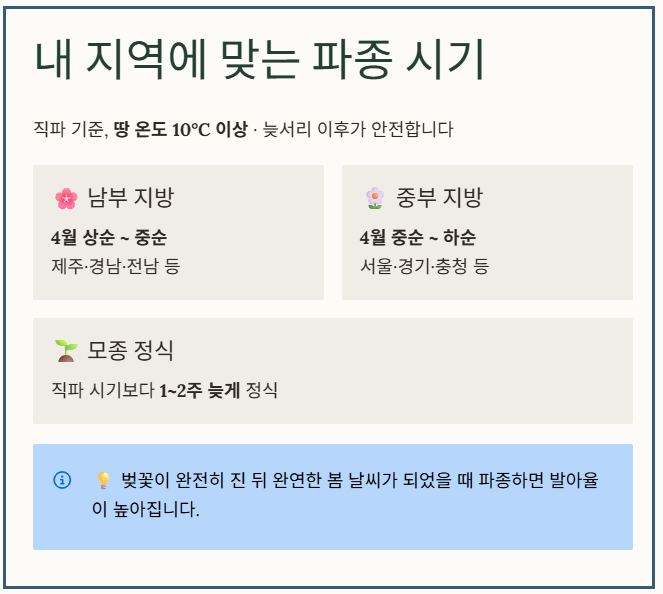 기온이 아직 쌀쌀할 때 무리하게 심기보다는, 벚꽃이 완전히 진 뒤 완연한 봄 날씨가 되었을 때 파종하는 것이 발아율을 높이는 데 도움이 됩니다.