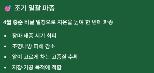 - 재배 방법은 일괄 파종(안정 수확)과 순차 파종(장기 수확)으로 나뉩니다.
