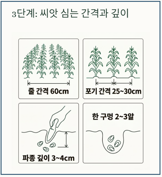 3단계: 옥수수 심는시기 기준 적정 간격과 깊이 준수하여 씨앗 심기