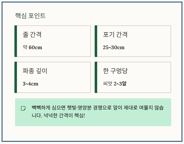 - 성공적인 재배를 위해서는 충분한 거름 공급, 25~30cm 간격 유지, 솎아주기(1~2개 유지)가 핵심입니다.