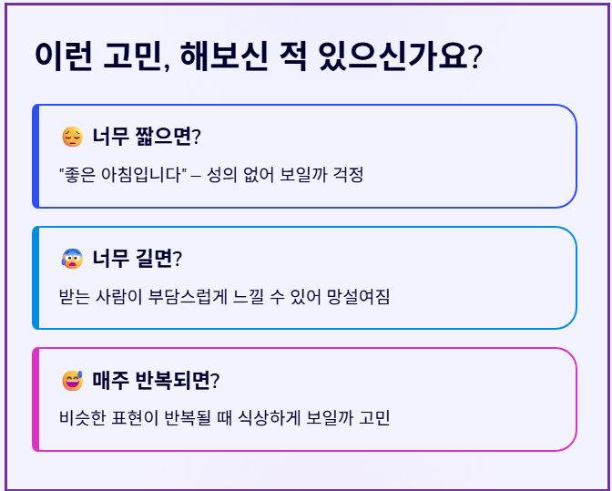 이럴 때 너무 긴 인사말은 오히려 업무 흐름을 방해하거나 부담으로 느껴질 수 있습니다.