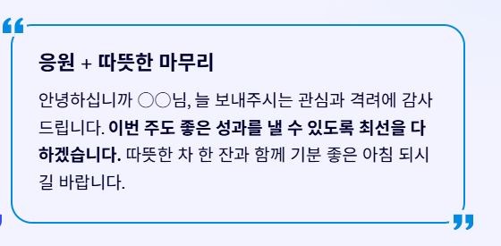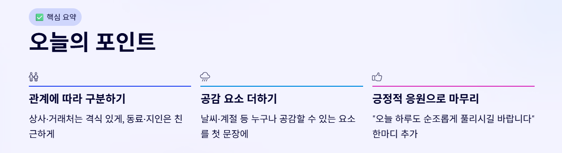 비가 오는 날, 쌀쌀한 아침, 화창한 날처럼 누구나 공감할 수 있는 요소를 첫 문장에 더하면 훨씬 자연스럽고 정성스러운 인사말이 됩니다. - 3단계: 긍정적인 응원 한마디 더하기