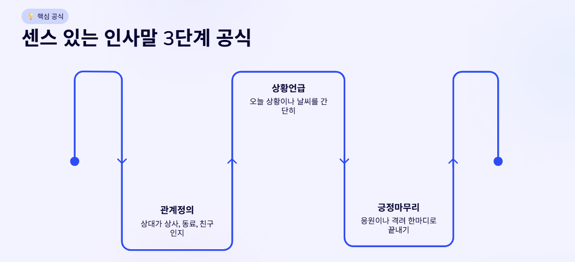 매번 상황에 맞는 인사말을 직접 떠올리기 어렵다면, 아래 3단계만 기억해 두면 어떤 상황에서도 자연스럽고 센스 있는 인사말을 빠르게 완성할 수 있습니다.