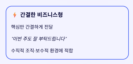 이 방식은 수직적인 조직이나 공적인 관계, 보수적인 업무 환경에서 특히 적합합니다.
