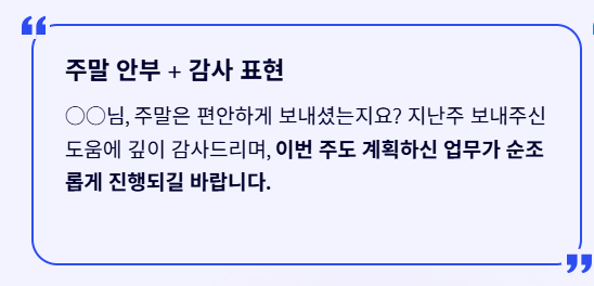 “이번 주도 잘 부탁드립니다”처럼 예의를 갖추면서도 핵심만 간결하게 전달하는 방식을 선호합니다.