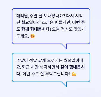 - “대리님, 주말은 잘 보내셨나요? 다시 시작된 월요일이라 조금은 힘들지만, 이번 주도 함께 힘내서 잘 버텨봅시다! 오늘 하루도 무사히 보내시고 점심도 맛있게 드세요.”