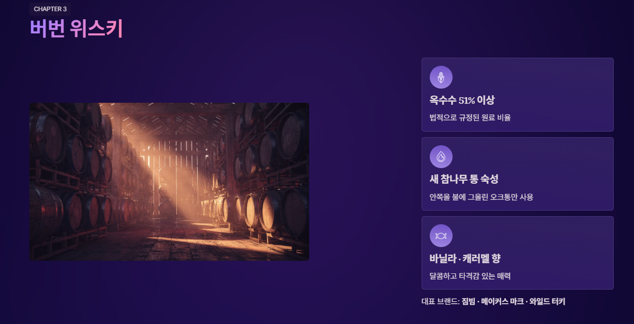 미국을 대표하는 위스키로, 엄격한 법적 기준을 따릅니다. 원료의 51% 이상이 반드시 '옥수수'여야 하며, 안쪽을 불에 그을린 새로운 참나무(오크) 통에서 숙성해야 합니다. 이 과정에서 바닐라, 캐러멜 같은 달콤한 향이 강하게 배어 나오며 특유의 타격감 있는 거친 매력을 자랑합니다.