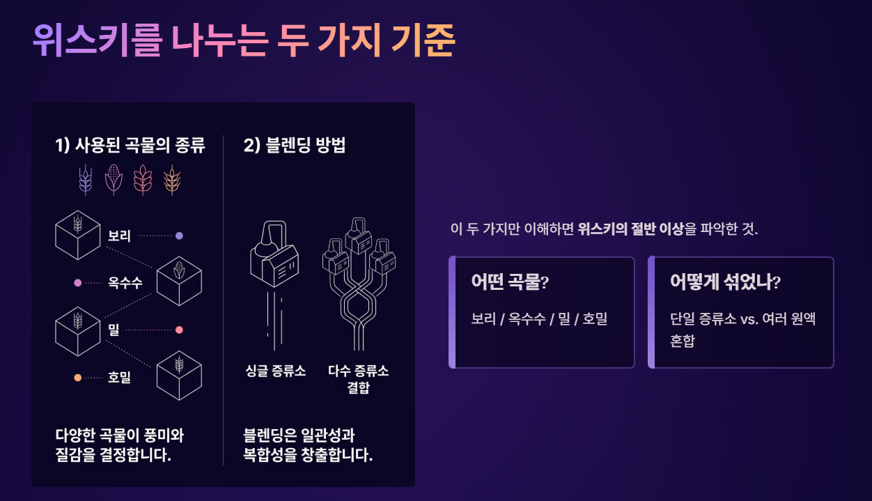 위스키를 구분하는 가장 중요한 기준은 '어떤 곡물을 사용했는가'와 '어떻게 섞었는가'입니다. 아래의 네 가지 핵심 카테고리만 이해해도 위스키의 절반 이상을 파악한 것입니다.