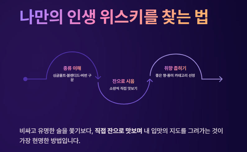 위스키는 재료와 블렌딩 여부에 따라 크게 증류소의 개성이 돋보이는 싱글 몰트, 부드럽고 조화로운 대중성의 블렌디드, 옥수수 특유의 달콤함과 타격감이 있는 버번으로 나뉩니다. 남들이 좋다고 하는 비싸고 유명한 술을 무작정 쫓기보다는, 각 종류의 특징을 이해하고 직접 잔 단위로 맛보며 내 입맛에 맞는 카테고리를 좁혀나가는 것이 위스키를 즐기는 가장 현명한 방법입니다. 이제 기본적인 지도를 펼쳤으니, 오늘 저녁 당신의 미각을 깨워줄 '인생 위스키'를 찾는 탐험을 시작해 보세요.